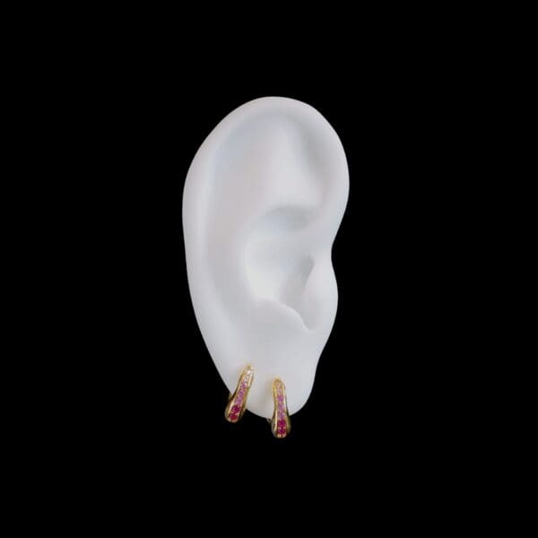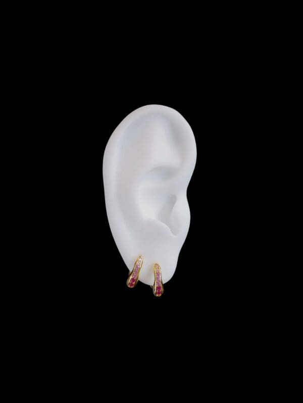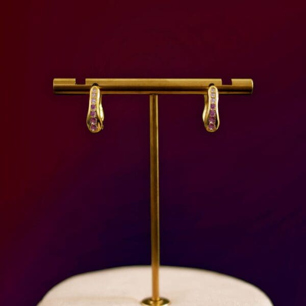 This unique shape of earrings was my very first hoop earrings I designed, with Play-doh in hand I experimented with various shapes until I discovered this current one that resonated my vision. I made it into five beautiful colours, they are made with 18-karat gold-plated vermeil sterling silver and shiny cubic zirconia. Truly one-of-a-kind! Most importantly it goes well with every outfits.