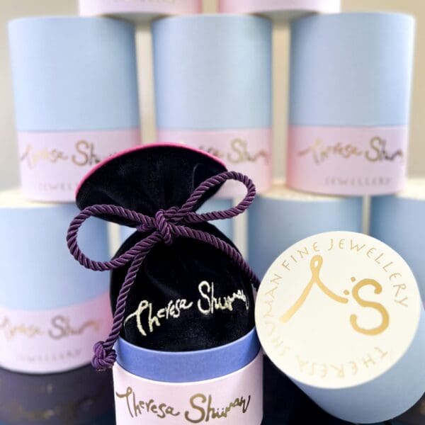 Every purchase comes with a Theresa Shuman signature box, high quality jewellery pouch, silver jewellery polishing cloth, one year warranty certificate and jewellery care instructions. All packaging materials are 100% hand-crafted.