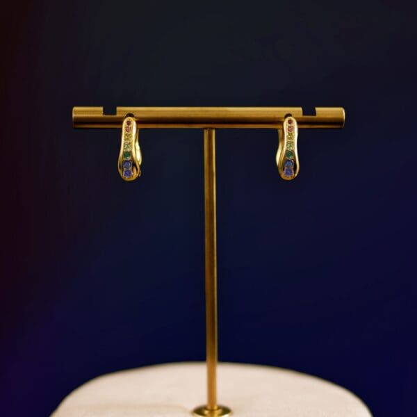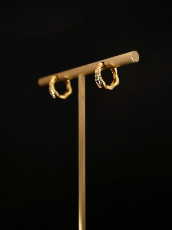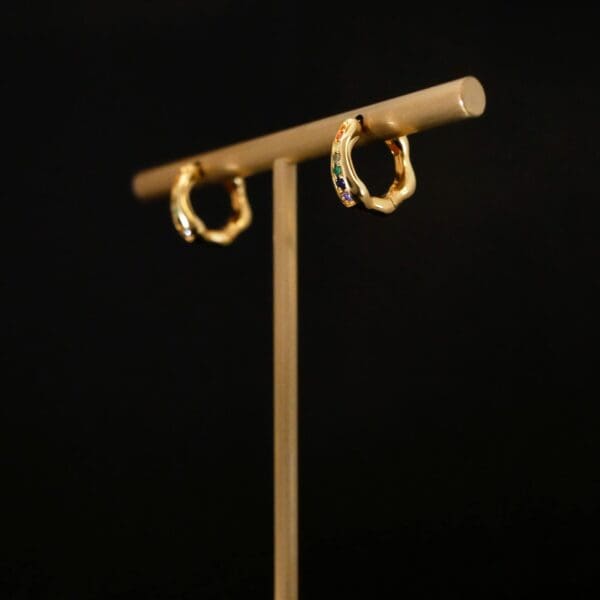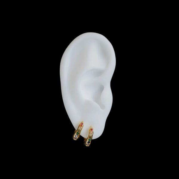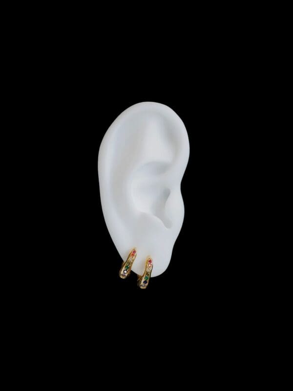This unique shape of earrings was my very first hoop earrings I designed, with Play-doh in hand I experimented with various shapes until I discovered this current one that resonated my vision. I made it into five beautiful colours, they are made with 18-karat gold-plated vermeil sterling silver and shiny cubic zirconia. Truly one-of-a-kind! Most importantly it goes well with every outfits.
