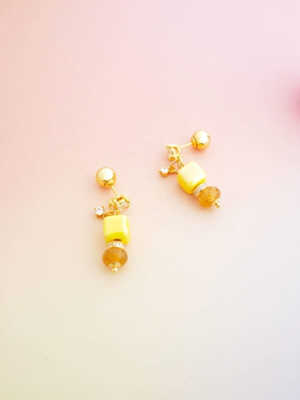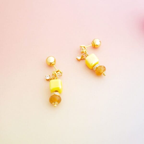 The yellow marshmallow bon bon earrings has a vibrant display of colours, this piece are made with 18-karat gold-plated vermeil sterling silver adorned with a combination of colourful handmade porcelain beads, gemstone beads and cubic zirconia. It also comes with Theresa’s signature ear studs, a round and smooth design wear nicely on ears, the ball backs design is crafted with care, ensuring comfort even when you are lying down.